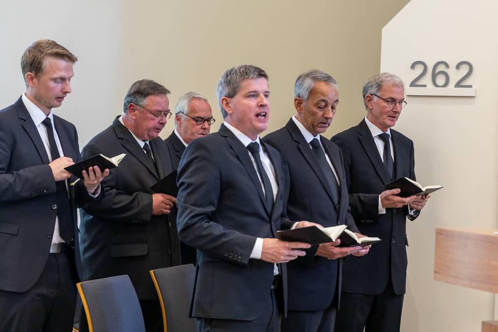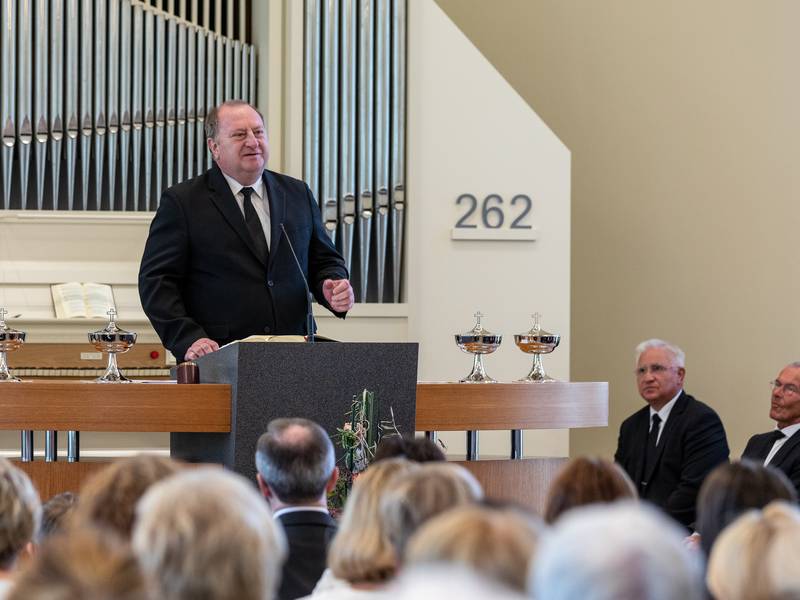 Noah habe die Neuorganisation seines Lebens hintenangestellt, und zuerst das Beste genommen und geopfert. "Was ist dir das Kostbarste?", fragte der Bezirksapostel in seiner Predigt und rief auf: "Gib davon dem Herrn etwas ab!" Noah habe nichts zurückbehalten oder anderweitig verwendet, "er hat alles gegeben". "Wenn wir dem Herrn etwas geben, dann ehrlich und offen und ganz." Zum Gottesdienst gehöre, "Gott das Herz zu öffnen und ihm dankbar zu sein". Das schaffe innere Ruhe und man könne Frieden finden. "Das ist Gottesdienst. Dafür ist dieses Haus gebaut, dass hier Gottesdienst in dieser Art gefeiert werden kann. Ich wünsche es der vereinigten Gemeinde von ganzem Herzen, dass ihr hier immer Gottesdienst in vollumfänglichen Sinn erleben könnt."